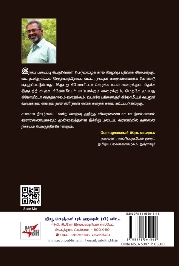 இந்தப் படைப்பு பெருவெள்ள பெருமழைக் கால நிகழ்வுப் பதிவாக அமைகிறது. வட தமிழ்நாட்டில் சேத்தியாத்தோப்பு வட்டாரத்தைக் கதைக்களமாகக் கொண்டு எழுதப்பட்டுள்ளது. இருபது கிலோமீட்டர் கெழக்க கடல் வரைக்கும், தெக்க இருபத்தி அஞ்சு கிலோமீட்டர் பாப்பாக்குடி வரைக்கும், மேற்கே முப்பது கிலோமீட்டர் விருத்தாசலம் வரைக்கும், வடக்கே பதினைஞ்சி கிலோமீட்டர் வடலூர் வரைக்கும் எங்கும் தண்ணீர்தான் எனக் கதைக் களம் சுட்டப்படுகின்றது.